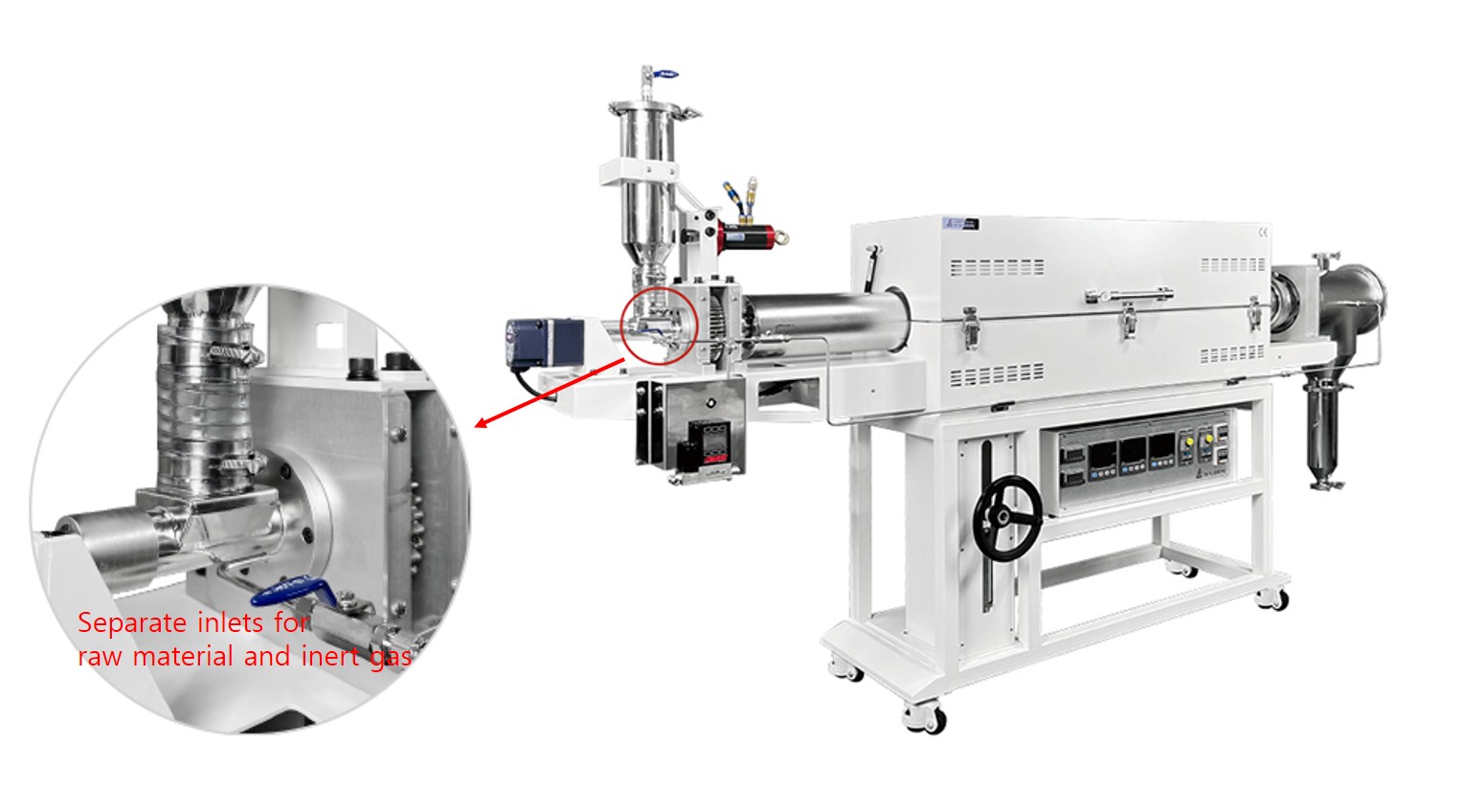 • Feeding and receiving system: Samples flow smoothly from the feeding tank at the upper end into the receiving vessel at the lower end.