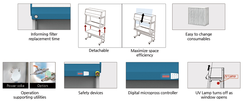 UV lamp will be off automatically when the glass door is open and the replacement of HEPA filter is so easy.